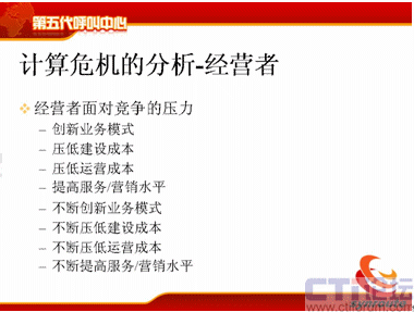 那么經(jīng)營者的壓力就更大了,首先我要創(chuàng)新業(yè)務(wù)模式,我以前是做客戶服務(wù)的,現(xiàn)在我要掙錢,我要增加收入,我要做電話營銷,壓低建設(shè)成本,壓低運營成本,這個是大家很容易理解的。同時他是不斷地創(chuàng)新業(yè)務(wù)模式,不斷地壓低建設(shè)成本,不斷地壓低運營成本,不斷地提高服務(wù)水平,這個不斷就給IT服務(wù)者傳遞了更大壓力。