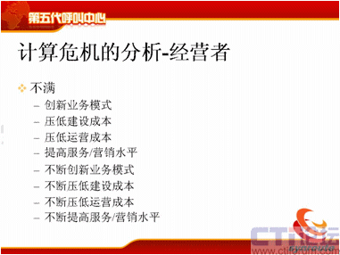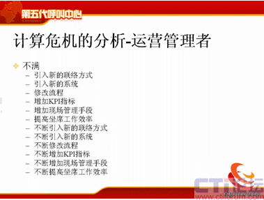計算危機的下一方面是運營管理者,可能在座很多人是做運營管理的,你們會不斷去跟IT服務(wù)者提需求,我下一個月想引進新的聯(lián)絡(luò)方式,下個月我想引進新的軟件,引進新的流程,我想增加KPI指標,我想增加現(xiàn)場的管理手段,我想提高座席的工作效率,后面也是不斷的,不斷地去引入新的聯(lián)絡(luò)方式。