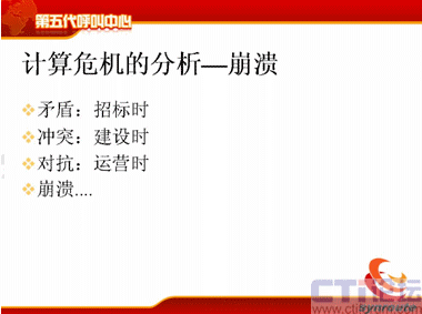 我把第五代呼叫中心的概念詳細地論述一下。主要是分成五個部分,第一個是第五代呼叫中心的定義;第二個計算危機的現(xiàn)狀;第三是計算危機的分析;第四第五代呼叫中心;第五是結(jié)論——迎接第五代呼叫中心的挑戰(zhàn)。