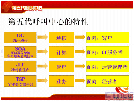 從分代上來講,和何總說的稍微有點差異,但是基本上一樣的,第一代是人工熱線的電話系統(tǒng),時間點也差不多;第二代是有了座席IVR、自動語音應(yīng)答這個特點;第三代是有了CTI、ACD企業(yè)級的呼叫中心;第四代是互聯(lián)網(wǎng),有VOIP、多媒體等等這些多媒體的呼叫中心。那么第五代是什么?第五代的典型特征是融合共享,它是有四個特性,UC、SOA、JIT和TSP,這是五代的幾個主要特點。