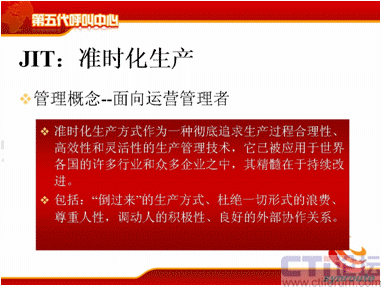 這四個特性是相輔相成的,首先在獨立方面,每一部分都有自己的特點,適應(yīng)自己企業(yè)發(fā)展的需要,同時也是相互制約的。首先我說這個獨立意識,對于呼叫中心來說,從經(jīng)營者的角度上,為什么要提TSP的概念呢?我們經(jīng)常遇到一個企業(yè)建立呼叫中心,是一個客戶服務(wù)中心,我們現(xiàn)在要做電話營銷了,那好吧,我們就建一套電話營銷系統(tǒng);這時候我們要做網(wǎng)絡(luò)方面的營銷,好了,我們再做一個網(wǎng)絡(luò)營銷的呼叫中心,這是經(jīng)營者現(xiàn)在意識亟待需要提高的。對于運營管理者來說,JIT思想,我剛才說過它是一個核心的,它是一個不斷需要改進流程的,改進去優(yōu)化的,提出各種KPI指標去優(yōu)化的,那么這個過程也是現(xiàn)在目前運營管理者一直比較薄弱的,需要一直提高的部分。