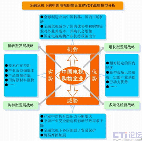 1992年至2009年以來,電視購物經(jīng)歷了從割據(jù)到統(tǒng)一,全國購物頻道網(wǎng)絡(luò)化;從粗放到科學(xué),頻道運(yùn)營模式專業(yè)化;從簡介到深度,頻道編排方式規(guī)律化、從滯后到及時,物流配送體系成熟化。電視購物被譽(yù)為繼零售、超市之后的第三次銷售革命,電視購物將成為金融危機(jī)經(jīng)濟(jì)形態(tài)下未來中國電視新的經(jīng)濟(jì)增長點(diǎn),而付費(fèi)電視、數(shù)字網(wǎng)絡(luò)電視的發(fā)展,是中國電視購物市場新的戰(zhàn)略機(jī)會。金融危機(jī)下的中國電視購物企業(yè)SWOT戰(zhàn)略模型分析如下: