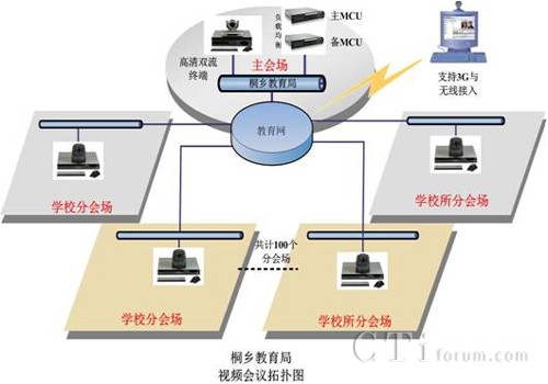 作為浙江省的教育強市,桐鄉(xiāng)市教育局下屬有各級各類學(xué)校近百所,隨著學(xué)校規(guī)模的日益擴大,以及教育信息化進程的推進,桐鄉(xiāng)教育局需要構(gòu)建遠程教學(xué)交流平臺,以實現(xiàn)資源共享。項目要求構(gòu)建的遠程教學(xué)交流平臺能夠使教育局與各學(xué)校之間實現(xiàn)點對點、一點對多點、和多點群組視頻會議、遠程課堂、課堂觀摩、互通教學(xué)等多種應(yīng)用。并且滿足以下需求: