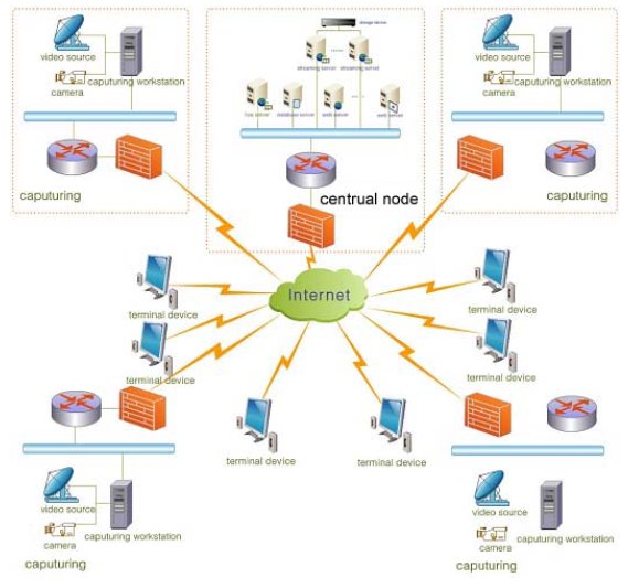 所有的部門的直播系統(tǒng)主要是進行部隊演習、會議等現(xiàn)場的直播,直播信號通過WebLIVE視頻直播采集系統(tǒng)編碼壓縮,通過局域網上傳到中心機房,實時發(fā)布。采集同時,將直播的數(shù)字信號存儲為AVI文件,上傳到放置在視頻點播服務器內,供其它地區(qū)的部隊指戰(zhàn)員進行點播。