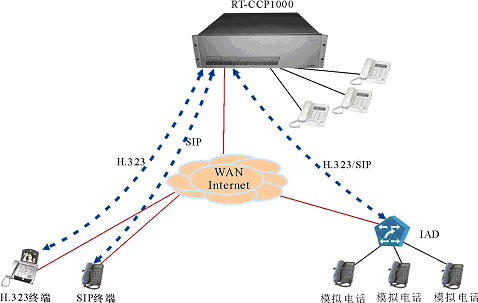- 多個位于不同地點的RT-CCP1000通過廣域IP網(wǎng)互連,組成一個統(tǒng)一系統(tǒng),實現(xiàn)遠(yuǎn)程無縫通信。