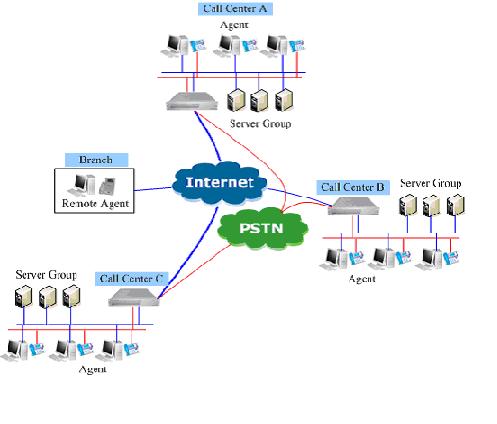 圖析:上圖中,整個(gè)分布式呼叫中心系統(tǒng)由三個(gè)獨(dú)立呼叫中心以及遠(yuǎn)端座席構(gòu)成,彼此都通過(guò)Internet或者其它網(wǎng)絡(luò)互連。三個(gè)呼叫中心每個(gè)都是獨(dú)立完整的呼叫中心,在任何時(shí)候,都可以獨(dú)立工作,遠(yuǎn)程座席則要注冊(cè)到某一呼叫中心上。