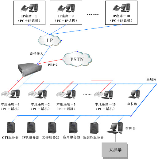 RT-CCP1000還有100M以太網(wǎng)接口,通過這個接口可以把RT-CCP1000連接到Internet上。每個IP座席配備VOIP終端(IP電話、軟電話或IAD)和電腦各一臺,VOIP終端把Proxy地址指向RT-CCP1000,電腦上安裝座席客戶端軟件,都通過Internet接入中心系統(tǒng)。