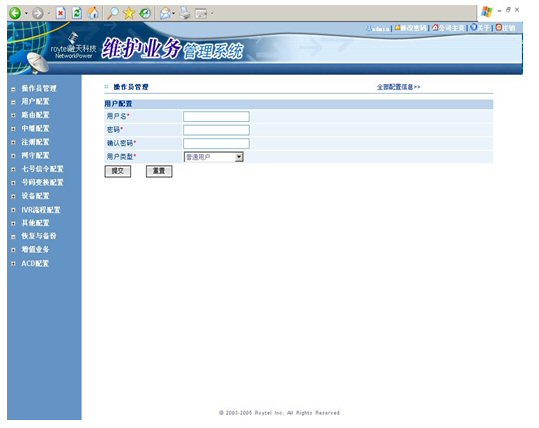 如果說節(jié)省了幾臺服務(wù)器和CTI中間軟件的開支對于用戶而言僅僅是一個直觀的體驗,那么RT-CCP1000的維護和管理將對用戶產(chǎn)生長久的影響,在維護和管理上仍然堅持著一體化核心理念的RT-CCP1000平臺,將用戶從多個廠家的設(shè)備互聯(lián)和維護中(程控交換機/CTI服務(wù)器/IVR服務(wù)器/錄音服務(wù)器)徹底的解放出來。RT-CCP1000基于WEB方式的全中文操作維護界面始終走在業(yè)界的最前沿。