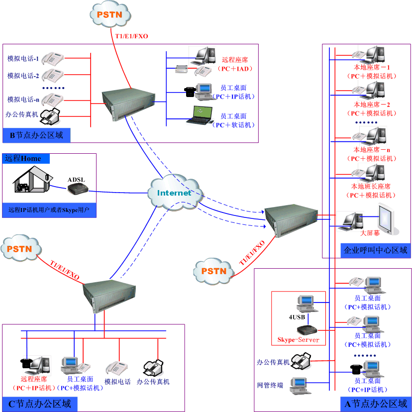 各區(qū)域內部員工可以進行0話費的通話和傳真外,還可以非常輕松的實現(xiàn)長途旁路功能 (即長途費用變市話費用功能);同時每部分機同時具有一個真實的當?shù)厥性捥柎a和一個內部分機號。
