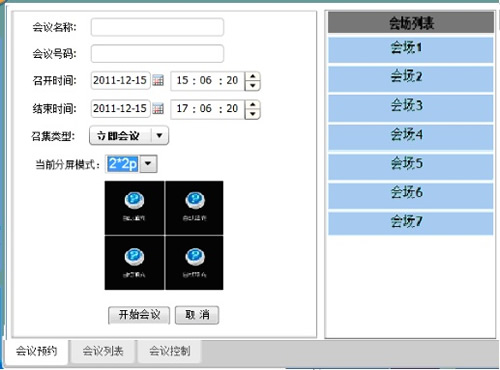 在調(diào)度臺界面主界面,點擊“視頻會議”按鈕,在終端區(qū)選擇會場,再次點擊“視頻會議”按鈕,界面切換到會議設置界面,進行相應的設置,點擊“開始會議”按鈕即可。