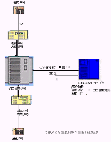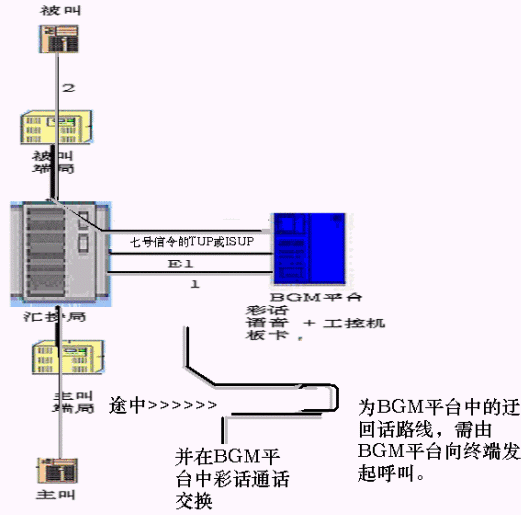 當(dāng)呼叫進(jìn)入?yún)R接局交換機(jī)并獲取呼叫的主被叫信息后,匯接局交換機(jī)對(duì)設(shè)置了彩話業(yè)務(wù)的用戶作呼叫轉(zhuǎn)移到BGM平臺(tái),并同時(shí)通過(guò)ISUP信令把主叫、被叫號(hào)傳遞給BGM平臺(tái),BGM平臺(tái)即時(shí)向被叫端局發(fā)起呼叫,當(dāng)被叫方摘機(jī),BGM平臺(tái)控制主叫與被叫接通,并根據(jù)被叫用戶保存的定制的彩話信息和業(yè)務(wù)邏輯對(duì)主被叫的通話進(jìn)行相應(yīng)的背景語(yǔ)音播放操作,該語(yǔ)音僅作為背景音樂(lè),不影響正常的雙方通話。當(dāng)主被叫任意方掛機(jī)時(shí),交換機(jī)將IVR單元和被叫的連接斷開(kāi),這樣就完成了一個(gè)完整的彩話服務(wù)。這種方案的技術(shù)優(yōu)勢(shì)是任何交換機(jī)都可實(shí)施,多么古老落后的運(yùn)營(yíng)設(shè)備都能實(shí)施,缺點(diǎn)是占用BGM平臺(tái)較大比例的語(yǔ)音板卡通道,語(yǔ)音板卡硬件的成本增加,因此需要選用高密度的信令語(yǔ)音一體化技術(shù)的語(yǔ)音板卡,可降低成本,并獲取較高的性能價(jià)格比。如下結(jié)構(gòu)示意圖: