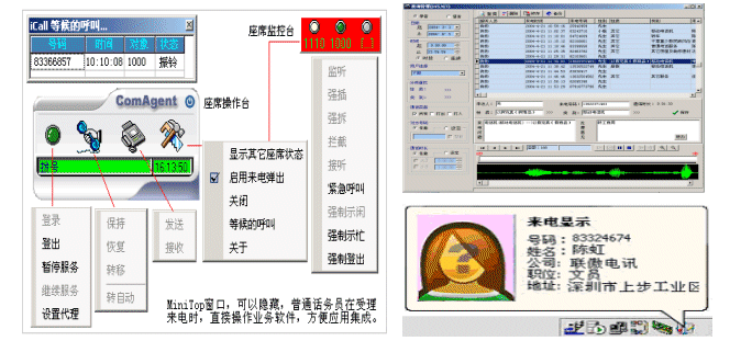 座席操作界面分類設(shè)計為Mini Top方式,可隨時隱藏或顯示;座席控件將來電號碼或在流程中收集的信息通過事件傳遞給業(yè)務(wù)系統(tǒng),話務(wù)員受理來電時,直接看到的是業(yè)務(wù)處理界面。