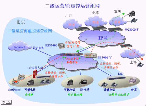 在這里,SS3000-V作為虛擬運營商自己的呼叫控制、業(yè)務(wù)管理和計費平臺,適合于在某一區(qū)域有很好客戶資源的虛擬運營商快速實現(xiàn)業(yè)務(wù)推廣。中繼媒體網(wǎng)關(guān)設(shè)備由基礎(chǔ)電信運營商提供。由于SS3000-V有很好的管理、計費特性,使得虛擬運營商可以輕松地參與運營,獲得業(yè)務(wù)收益。