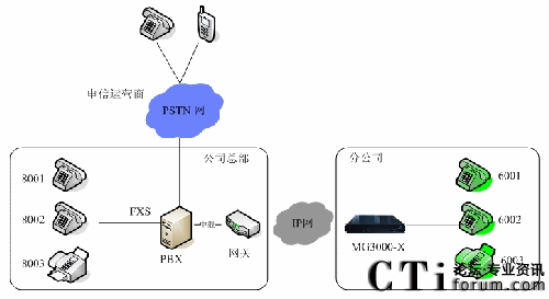 公司總部增加一臺語音網(wǎng)關(guān),通過中繼線與原有的PBX相連,異地分公司增加一臺IPPBX,下面開通分機,公司總部和分公司通過IP網(wǎng)連接在了一起。