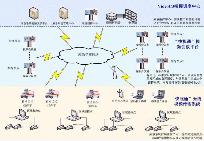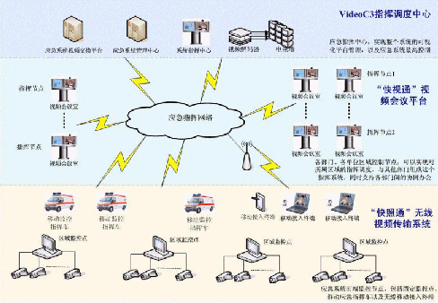 C3I視頻應(yīng)急指揮協(xié)同系統(tǒng)在政府IP網(wǎng)絡(luò)中處于城市的神經(jīng)中樞。它將政府各個(gè)部門、單位聯(lián)系成為一個(gè)整體。在C3I視頻應(yīng)急指揮協(xié)同系統(tǒng)的前端,由"快照通"無(wú)線視頻傳輸系統(tǒng)對(duì)政府所屬各個(gè)單位進(jìn)行實(shí)時(shí)監(jiān)控,時(shí)刻掌握現(xiàn)場(chǎng)動(dòng)態(tài),該部分支持固定點(diǎn)監(jiān)控,也支持移動(dòng)指揮點(diǎn)和無(wú)線移動(dòng)接入終端,保證了前方工作的靈活、機(jī)動(dòng)性;在系統(tǒng)的指揮中心部分,由VideoC3指揮調(diào)度中心來(lái)支持,它一方面需要對(duì)前端的監(jiān)控信息進(jìn)行控制,同時(shí),要對(duì)整個(gè)政府進(jìn)行綜合管理調(diào)度,在發(fā)生突發(fā)狀態(tài)的時(shí)刻,現(xiàn)場(chǎng)前端"快照通"捕獲的相應(yīng)信息通過C3I系統(tǒng)平臺(tái),迅速傳遞至指揮中心部分,政府管理人員通過VideoC3指揮調(diào)度中心對(duì)前端進(jìn)行遠(yuǎn)程指揮,在第一時(shí)間緊急處理現(xiàn)場(chǎng)突發(fā)事件;在整個(gè)C3I系統(tǒng)中,政府各個(gè)部門、單位之間通過"快視通"視頻會(huì)議平臺(tái)進(jìn)行辦公交流,支持各部門間的協(xié)同辦公,同時(shí),也可以通過其實(shí)現(xiàn)對(duì)所屬區(qū)域的指揮調(diào)度。