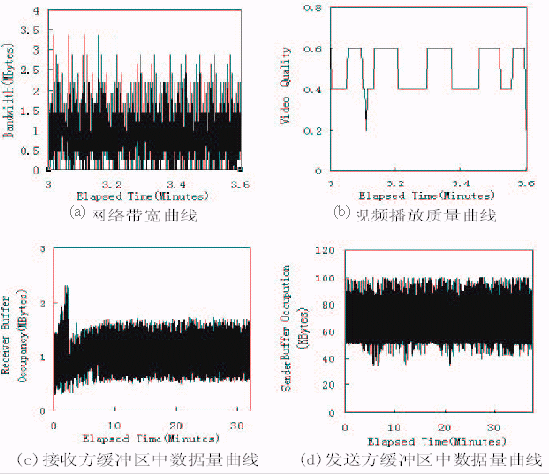 圖3給出了在劇烈的帶寬變化情況下,應(yīng)用該技術(shù)的視頻點(diǎn)播系統(tǒng)所達(dá)到的性能。在圖3中,(a)表示所使用的帶寬情況;(b)表示客戶端得到的視頻播放質(zhì)量;(c)和(d)分別表示在播放過(guò)程中接收緩沖區(qū)和發(fā)送緩沖區(qū)中的數(shù)據(jù)量情況。對(duì)比圖3(a)(b)可以看出,在網(wǎng)絡(luò)帶寬劇烈變化的情況下,視頻播放質(zhì)量的變化很平緩。由圖3(c)知,接收方緩沖區(qū)沒(méi)有發(fā)生上溢或下溢,這表明客戶始終能享受到連續(xù)的視頻播放,沒(méi)有出現(xiàn)播放卡殼;也沒(méi)有出現(xiàn)因?yàn)榫彌_區(qū)上溢而丟失從網(wǎng)絡(luò)傳過(guò)來(lái)的數(shù)據(jù)。圖3(d)則表明發(fā)送緩沖區(qū)始終在80k字節(jié)左右,沒(méi)有發(fā)生下溢,說(shuō)明數(shù)據(jù)發(fā)送模塊始終有數(shù)據(jù)可發(fā),即網(wǎng)絡(luò)帶寬得到了充分利用。