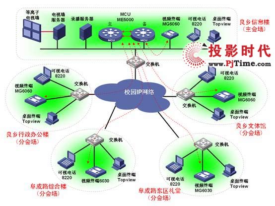 ME5000(配置32*768K)型MCU,在主會場及各分會場會議室共配置9臺高清會議室型會議終端(MG6060)和4臺標(biāo)清會議室終端(MG6030);同時學(xué)校領(lǐng)導(dǎo)桌面部署120部可視電話和12套桌面終端,具體視頻會議組網(wǎng)拓撲圖如下所示: