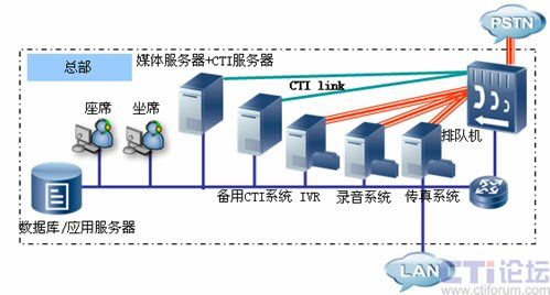 北京為總部中心,將部署CTI服務(wù)器、IVR服務(wù)器、錄音系統(tǒng)、傳真系統(tǒng)、文件服務(wù)器及相關(guān)業(yè)務(wù)數(shù)據(jù)庫服務(wù)器,為各個營業(yè)網(wǎng)點提供業(yè)務(wù)支撐?偛繉φ麄網(wǎng)絡(luò)進(jìn)行管理,包括平臺配置、業(yè)務(wù)管理、數(shù)據(jù)管理、人員調(diào)度等。在總部CTI系統(tǒng)我們采用主備模式,確保了在出現(xiàn)網(wǎng)絡(luò)故障主CTI系統(tǒng)無法提供服務(wù)情況下,備用CTI系統(tǒng)將接替主CTI系統(tǒng)工作,確保了整個系統(tǒng)的正常工作。硬件平臺方面,UAP我們采用了雙主控板雙電源供電工作模式,這對系統(tǒng)長期穩(wěn)定工作提供了保障。總部同時也部署北京農(nóng)村商業(yè)銀行300個坐席人員,這些坐席人員可以按照業(yè)務(wù)進(jìn)行區(qū)分,大部分坐席精通一般的業(yè)務(wù),為普通客戶提供優(yōu)質(zhì)服務(wù),少部分坐席(專業(yè)坐席)人員為高價值客戶提供高級的專業(yè)的優(yōu)質(zhì)服務(wù),在普通坐席比較忙時,專業(yè)坐席可以為普通用戶提供服務(wù),坐席中,還有極少部分可以充當(dāng)坐席管理員角色,他們也可以監(jiān)控各個分中心坐席服務(wù)的質(zhì)量,對有問題服務(wù)可以實現(xiàn)監(jiān)聽、監(jiān)察、和強拆功能,及時的保證服務(wù)質(zhì)量,維護了企業(yè)形象。