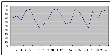 底下這是某呼叫中心從早上8點開始,一直到晚上6點,每隔半個小時的服務水平。可以很清楚的看到,服務水平在91到48這中間震蕩,平均服務水平是73左右。