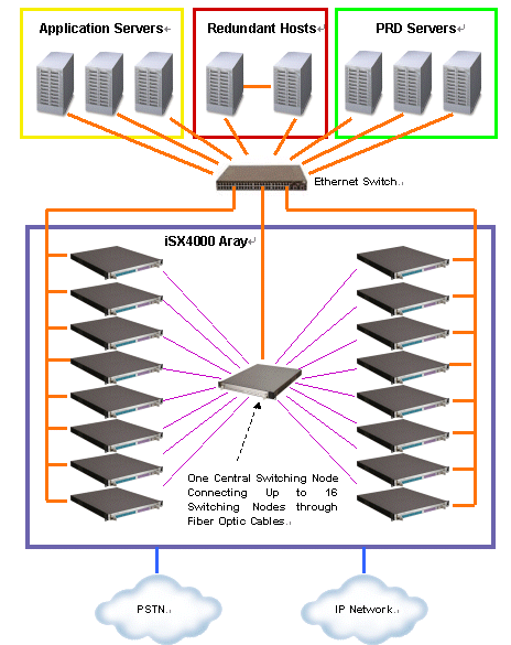 下圖顯示了一個(gè)大容量iSX4000 UAP系統(tǒng),該系統(tǒng)由兩臺(tái)互為冗余備份的主機(jī)、三臺(tái)應(yīng)用服務(wù)器、三臺(tái)PRD服務(wù)器和一個(gè)由16臺(tái)iSX4000交換機(jī)和一臺(tái)中央交換節(jié)點(diǎn)構(gòu)成的iSX4000陣列構(gòu)成。交換陣列的16臺(tái)iSX4000交換機(jī)通過(guò)光纖和中央交換節(jié)點(diǎn)連接。中央交換節(jié)點(diǎn)提供系統(tǒng)跨節(jié)點(diǎn)交換能力。系統(tǒng)可同時(shí)提供最多31744