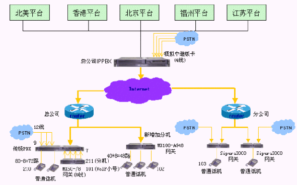 保留南京總公司原有傳統(tǒng)的集團(tuán)電話交換機(jī),電話號碼固定。需要通過PSTN外線撥打當(dāng)?shù)氐氖性,還可以撥打VoIP網(wǎng)絡(luò)電話。