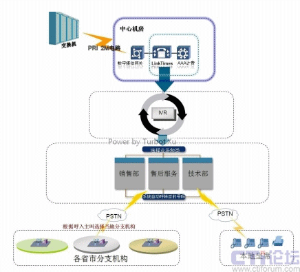 關(guān)于IP CallCenter 的應(yīng)用有很多,最近開始比較流行的一種為托管型呼叫中心系統(tǒng),下面我們共同簡單說明這種應(yīng)用中的一種方式:無坐席 ,話路通過中心點的IP CallCenter 直接進行呼叫轉(zhuǎn)移,IP CallCenter 提供ACD等服務(wù),號碼采用400接入方式。