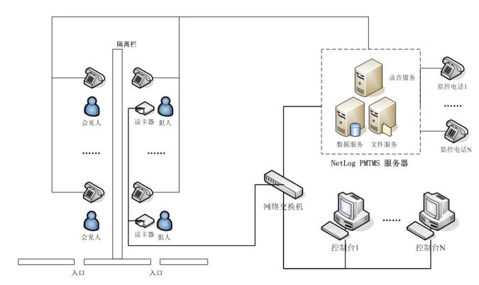 NetLog PMTMS會客室電話管理系統(tǒng)采用基于分布式、多層控制管理體系的設計思想,將電話線路與內部網絡有效地結合在一起,形成一套完整管理系統(tǒng),包括會見監(jiān)控、通話錄音、數(shù)據(jù)管理。