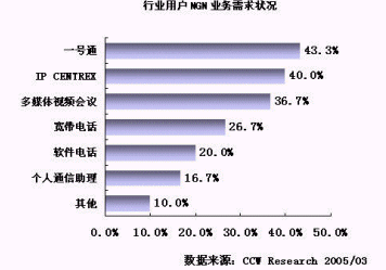 NGN 成為電信運營商滿足用戶需求的有力武器。不同的行業(yè)用戶對基于 NGN 推出的電信業(yè)務(wù)表現(xiàn)出了較大的需求差異,例如: IT通信、物流和服務(wù)業(yè)對 IP CENTREX 、多媒體視頻會議和寬帶電話等業(yè)務(wù)比較感興趣,而政府用戶對一號通等業(yè)務(wù)比較感興趣。不同行業(yè)對業(yè)務(wù)需求具有差異性,這就要求運營商基于 NGN 平臺開發(fā)的業(yè)務(wù)要有更大的靈活性,要有突出用戶通信需求的整體解決方案,要能滿足用戶的個性化需求。