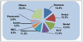 2008年,中國企業(yè)通信市場的份額被5大企業(yè)通信廠商所占據(jù),包括西門子,Avaya,北電,阿爾卡特朗訊和思科。