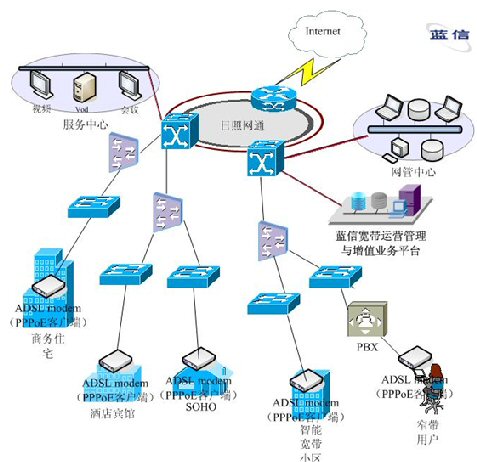 在以以太網(wǎng)技術(shù)為主建設(shè)的運(yùn)營(yíng)區(qū)域,在中心由一臺(tái)模塊化的核心交換機(jī)支持,輔以多臺(tái)BASE設(shè)備連接,在接入層用交換機(jī)做接入設(shè)備,保證用戶(hù)數(shù)據(jù)的快速傳播。在網(wǎng)絡(luò)核心處,部署信利公司的藍(lán)信寬帶認(rèn)證計(jì)費(fèi)系統(tǒng),負(fù)責(zé)對(duì)全網(wǎng)用戶(hù)的安全認(rèn)證、計(jì)費(fèi)及管理。藍(lán)信寬帶認(rèn)證計(jì)費(fèi)系統(tǒng)除支持標(biāo)準(zhǔn)的RADIUS協(xié)議外,還支持PPPoE、802.1x認(rèn)證。在用戶(hù)終端處,部署藍(lán)信特制的PPPoE客戶(hù)端,實(shí)現(xiàn)撥號(hào)上網(wǎng)。