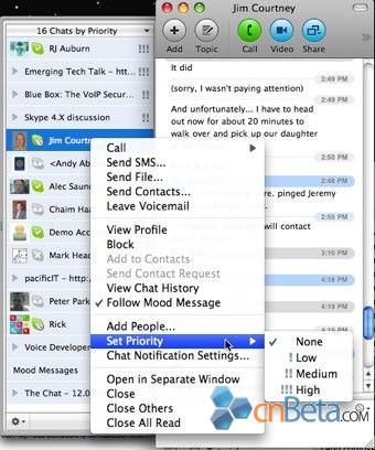 Skype 2.8 for Mac將于明天正式發(fā)布,它將帶來全新的功能,包括"屏幕共享"(screen sharing)和整合Wi-Fi熱點連接功能。此次新版本將首先向Mac OS X發(fā)布,不知道是不是為了迎接Macworld的到來。此次版本主要更新以下幾點: