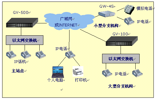 - 分公司:選用一臺(tái)4口網(wǎng)關(guān)設(shè)備,接入到互聯(lián)網(wǎng)絡(luò),通過(guò)公共的IP交換中心建立起呼叫連接,實(shí)現(xiàn)打電話的功能。模擬了通過(guò)網(wǎng)關(guān)設(shè)備接入PBX(電話程控交換機(jī)),如果其它分部也要接入PBX,與此情況類(lèi)似。(詳見(jiàn)后面的"撥號(hào)示例")