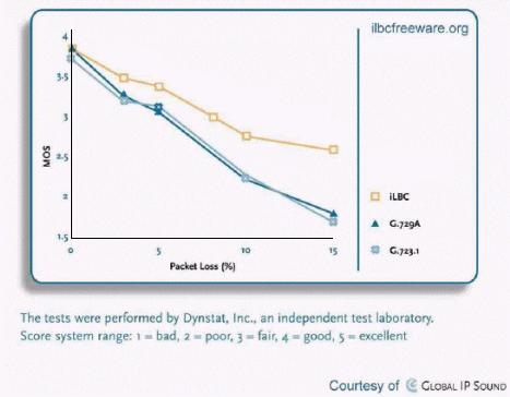 無論在高丟包率條件下還是在沒有丟包的條件下,iLBC的語音質(zhì)量都優(yōu)于目前流行的G.723.1, G.729A等標準編解碼;而且丟包率越大,使用iLBC的語音質(zhì)量優(yōu)勢越明顯。通常情況下,為了衡量IP網(wǎng)絡語音質(zhì)量,將≥5%丟包率的網(wǎng)絡情況定義為VoIP的極限網(wǎng)絡條件。經(jīng)過語音質(zhì)量測試,即使在5%丟包率的情況下,iLBC仍然能夠提供相當于GSM手機的語音質(zhì)量。