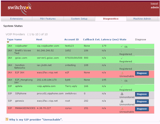 圖5中綠色表示正常,紅色表示出現(xiàn)問題,白色表示從沒有接通過。如果你按診斷(Diagnose),系統(tǒng)便會通過自動測試,告訴你問題出自哪一部分。如果需要對每一個的詳細(xì)解析,可以按底部Why這個標(biāo)題,找尋答案。類似的終端、話機等配置、硬件診斷等,也有非常明了的界面與解決問題的辦法。