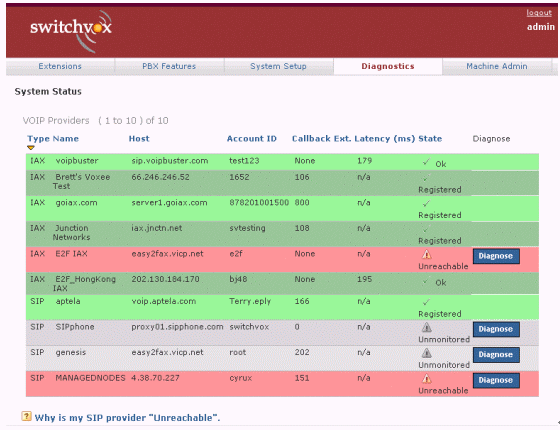 圖2中綠色表示正常,紅色表示出現(xiàn)問(wèn)題,白色表示從沒(méi)有接通過(guò)。如果你按診斷(Diagnose),系統(tǒng)便會(huì)通過(guò)自動(dòng)測(cè)試,告訴你問(wèn)題出自那一段落。如果需要對(duì)每一個(gè)的詳細(xì)解析,可以按底部Why這個(gè)標(biāo)題,找尋答案。類(lèi)似的終端、話機(jī)等配置、硬件診斷等,也有非常明撩的界面與解決問(wèn)題的辦法。
