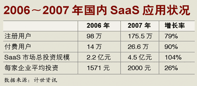 SaaS在中國正步入一個快速發(fā)展的時期。計世資訊調(diào)查數(shù)據(jù)顯示,2007年國內(nèi)SaaS市場在諸多積極因素的刺激下快速發(fā)展,用戶的投資額度和付費(fèi)用戶數(shù)快速增長,使得企業(yè)用戶在在線管理服務(wù)的投入上有較快的增長。2007年企業(yè)用戶在SaaS上的平均投資額度比2006年增長了約26%。2007年管理型SaaS應(yīng)用的總投資規(guī)模為4.5億元,但與2007年管理軟件市場整體規(guī)模248億元比,目前在線管理服務(wù)市場規(guī)模仍然相當(dāng)小。