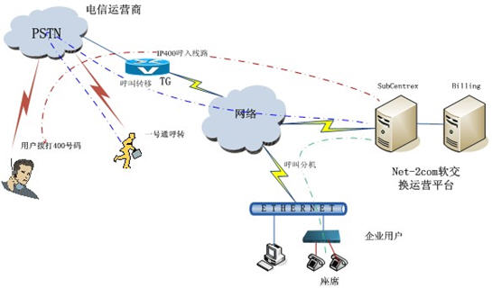 對需要400業(yè)務的呼叫中心客戶,需要申請一個“400xxxxxx”作為其在全國的統(tǒng)一接入碼;在全國任何范圍內,主叫用戶只需撥打該“400xxxxxx”號碼,無須加撥區(qū)號,便可按照企業(yè)業(yè)務用戶預先設定的方案,將呼叫直接接續(xù)到客戶所指定的電話號碼或呼叫中心。