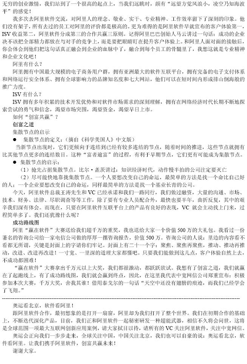 余輝先生在大會(huì)上表示,對(duì)于整個(gè)互聯(lián)網(wǎng)、軟件產(chǎn)業(yè)鏈條來(lái)說(shuō),在線軟件(SaaS)不但是最熱門的話題,更是順應(yīng)市場(chǎng)需要的新技術(shù)趨勢(shì),中寬網(wǎng)信將和阿里軟件一起,在打造全球“軟件沃爾瑪超市”的過(guò)程中發(fā)揮自己的技術(shù)應(yīng)用研發(fā)強(qiáng)項(xiàng),為全國(guó)2億互聯(lián)網(wǎng)網(wǎng)民提供更豐富便利、更低成本的軟件服務(wù)。余輝先生還和與會(huì)嘉賓分享了中寬網(wǎng)信和阿里軟件合作過(guò)程中的體會(huì)和感悟。
