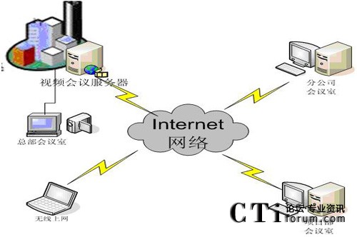 視維根據(jù)互聯(lián)網的網絡現(xiàn)狀和IT硬件資源制定了一套可行的平民化的低帶寬下的高清視頻會議解決方案。以企業(yè)總部為主會場,其他地區(qū)的分公司、各營銷網點和各移動多媒體終端作為分會場,其網絡拓撲圖如下: