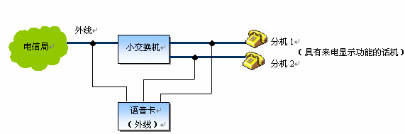 說明:將語音卡的外線通道并接在小交換機的全部內(nèi)外線端口上,在軟件的控制下,不僅可以將外線來電號碼轉(zhuǎn)發(fā)至分機,并且還可以在內(nèi)線通話時,看到通話對方的號碼,非常實用。當然,如果直接采用語音卡(外線+座席)來構(gòu)成小交換機,則系統(tǒng)更為簡潔,成本也大為降低。