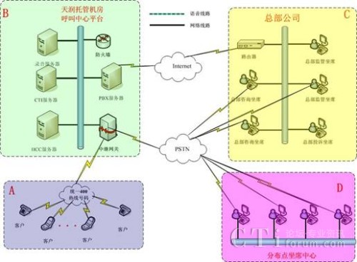 方案一:400電話+托管呼叫中心平臺(tái)+坐席分布在總部和分布點(diǎn)