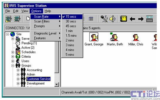 同時(shí)IRIS還可對座席工作的狀態(tài)進(jìn)行分組實(shí)時(shí)監(jiān)控或監(jiān)聽、可直觀的了解的座席的狀態(tài)(離席、入席、電話中、電話待命中、已規(guī)劃中);可對座席人員進(jìn)行人員跟蹤的實(shí)時(shí)監(jiān)聽。