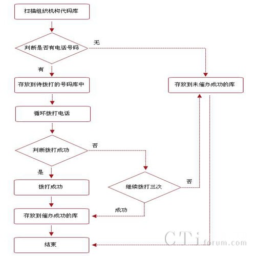 催辦業(yè)務(wù)負(fù)責(zé)完成語音提示。系統(tǒng)自動(dòng)掃描組織機(jī)構(gòu)代碼庫,查詢當(dāng)日需要年檢的組織機(jī)構(gòu)代碼信息,對(duì)沒有電話號(hào)碼的存入到未催辦的組織機(jī)構(gòu)代碼庫中,有電話號(hào)碼的存入到待催辦的電話號(hào)碼庫中,并根據(jù)設(shè)置的時(shí)間撥打手機(jī)號(hào)碼,對(duì)于語音提示成功的,存放到相應(yīng)的庫中。催辦業(yè)務(wù)后臺(tái)功能包括: