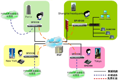 隨著公司在全世界開設(shè)眾多的部門,IP電話技術(shù)將會是不同分公司之間實(shí)現(xiàn)低費(fèi)用高品質(zhì)語音通訊的方式。SINOCO公司的IP-PBX 系統(tǒng)解決方案,利用 SPX-5130設(shè)備通過互連網(wǎng)連接到公司的各個分支機(jī)構(gòu),提供分級體系結(jié)構(gòu),更進(jìn)一步提供了可靠的,靈活的語音通訊解決方案,從而滿足公司快速回應(yīng)客戶的需求。同時,它也降低了總部和分部之間的電話費(fèi)用。總部和分部間昂貴的國際電話費(fèi)用將不再存在, 而且享受高品質(zhì)的語音通訊質(zhì)量。