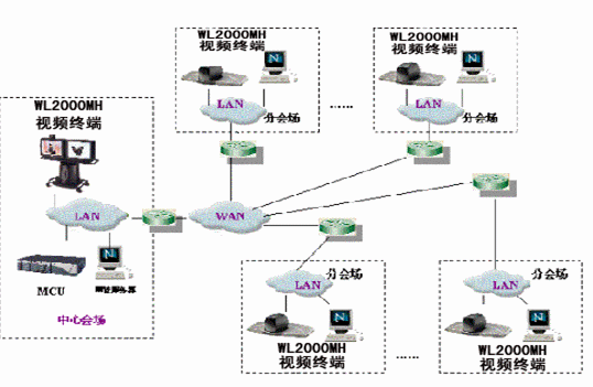 分會(huì)場配置WL-2000MH會(huì)議終端,具有快速以太網(wǎng)LAN接口,在H.323上可達(dá)到4M。實(shí)際應(yīng)用中,分會(huì)場工作速率在512K-2M自適應(yīng)可調(diào)。中心會(huì)場可通過局域網(wǎng)對(duì)分會(huì)場設(shè)備遠(yuǎn)程管理。終端通過RS232口連接攝像機(jī),中心會(huì)場可進(jìn)行遙控分會(huì)場的攝像機(jī),注本地也可以進(jìn)行攝像機(jī)控制。WL-2000MH會(huì)議終端有兩路視頻輸出,一路為遠(yuǎn)端視頻,一路為本地視頻,分會(huì)場可選擇兩個(gè)顯示設(shè)備如大屏幕彩電或背投電視。