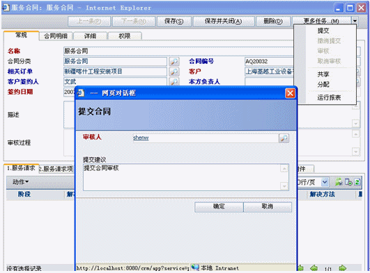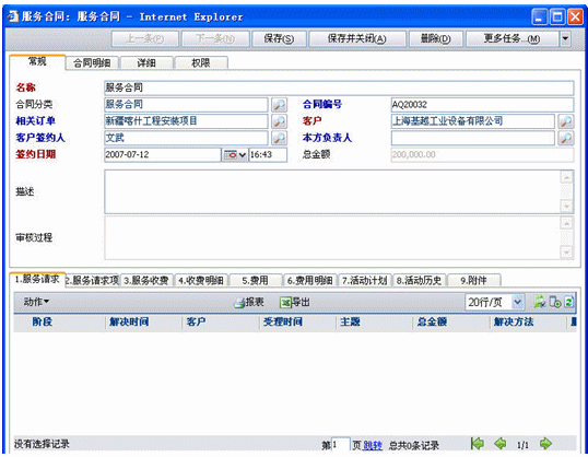 服務(wù)合同是也分為兩種,一種是非公司項(xiàng)目的服務(wù)請(qǐng)求此時(shí)沒(méi)有與訂單關(guān)聯(lián);二種是公司項(xiàng)目后服務(wù)請(qǐng)求,此時(shí)可以關(guān)聯(lián)訂單也可以不關(guān)聯(lián)訂單,如果關(guān)聯(lián)訂單就可以將訂單產(chǎn)品明細(xì)導(dǎo)入合同明細(xì)中(導(dǎo)入明細(xì)是可以調(diào)整數(shù)量和價(jià)格的).