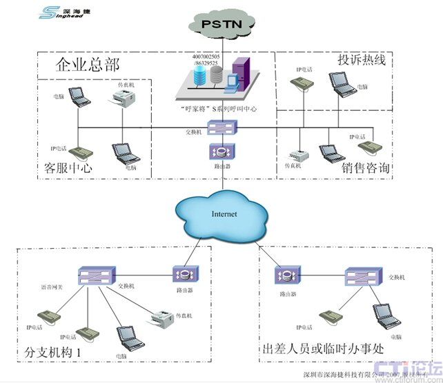 基于“呼家將”呼叫中心系統(tǒng)靈活的組網(wǎng)結(jié)構(gòu)以及強大的系統(tǒng)功能,其完全可以替代傳統(tǒng)的PBX系統(tǒng),洲際大酒店可以在公司總部建立中央呼叫中心系統(tǒng),其配置3條數(shù)字中繼線的接入能力,后續(xù)可以平滑擴(kuò)充成4條數(shù)字中繼線接入。內(nèi)線為300部座機,全部使用模擬電話線和電話機,并且可以繼續(xù)平滑擴(kuò)容,對于臨時辦公人員、出差人員以及外地辦事處,可以使用軟終端或者網(wǎng)關(guān)+普通電話的形式接入,其最大的優(yōu)勢是成本低,接入靈活。