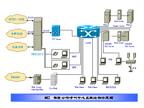 某保險公司電話中心采取全國集中服務(wù)方式,其結(jié)構(gòu)如圖2所示,在電話呼叫中心集中管理所有人工語音坐席和電話中心運行所需的所有業(yè)務(wù)數(shù)據(jù)、語音文件和硬件設(shè)備,服務(wù)全國。我們設(shè)計的方案具有如下特點:
