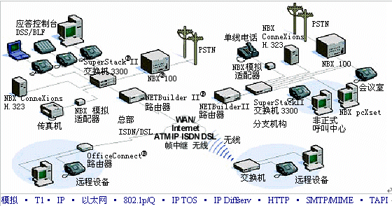 使用標(biāo)準(zhǔn)多協(xié)議路由器,諸如3Com PathBuilder或NET Builder II路由器,您能夠通過廣域網(wǎng)或Internet將多個分支機(jī)構(gòu)與您的總部系統(tǒng)相連接。您可以隨意選擇網(wǎng)絡(luò): 支持工業(yè)標(biāo)準(zhǔn)Internet協(xié)議(IP)聯(lián)網(wǎng)的DSL、電纜、幀中繼或ISDN。您甚至能夠通過使用3Com NBX ConneXtions H.323網(wǎng)關(guān)應(yīng)用,來充分利用低成本、高質(zhì)量的IP語音 (VoIP) H.323服務(wù)。因為NBX ConneXtion使用Internet作為長途線路上本地到本地的撥號路徑,因此它能夠以極低的成本提供傳統(tǒng)電話專用線路和后端分機(jī)(OPX)線路的優(yōu)勢。
