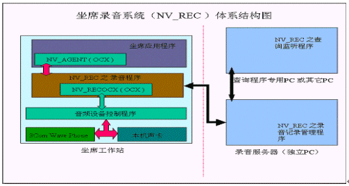 NV-REC 專用錄音系統(tǒng)與傳統(tǒng)的使用錄音板卡對坐席(電話)并線錄音的方式截然不同,由于3Com IPCC的所有坐席服務(wù)均是通過安裝在坐席終端上的軟件電話,通過聲卡、耳機(jī)來實(shí)現(xiàn)與客戶的電話溝通的。我們是直接監(jiān)測軟件電話,從聲卡設(shè)備通道中直接形成實(shí)時(shí)語音通話的標(biāo)準(zhǔn)WAV文件,從而完成對坐席的全程錄音功能。